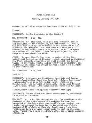 Pages 15-36 of the verbatim stenotype transcription of the Debates of the 1943-1944 Constitutional Convention of Missouri. These debates spanned from January 5, 1944 - September 29, 1944. The full transcription includes over 7,000 pages.