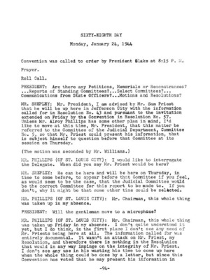 Pages 94-130 of the verbatim stenotype transcription of the Debates of the 1943-1944 Constitutional Convention of Missouri. These debates spanned from January 5, 1944 - September 29, 1944. The full transcription includes over 7,000 pages.