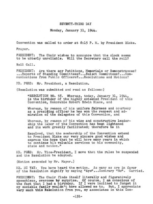 Pages 131-143 of the verbatim stenotype transcription of the Debates of the 1943-1944 Constitutional Convention of Missouri. These debates spanned from January 5, 1944 - September 29, 1944. The full transcription includes over 7,000 pages.