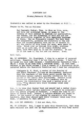 Pages 268-337 of the verbatim stenotype transcription of the Debates of the 1943-1944 Constitutional Convention of Missouri. These debates spanned from January 5, 1944 - September 29, 1944. The full transcription includes over 7,000 pages.