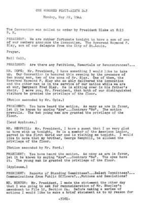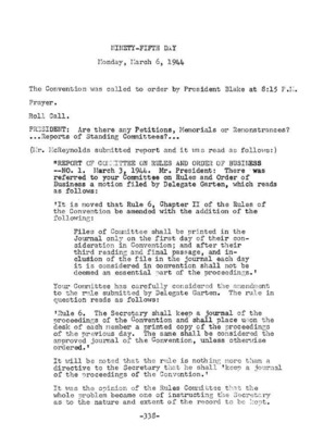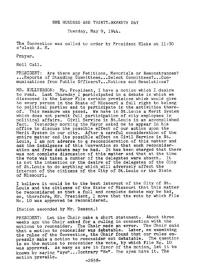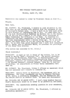 Pages 144-177 of the verbatim stenotype transcription of the Debates of the 1943-1944 Constitutional Convention of Missouri. These debates spanned from January 5, 1944 - September 29, 1944. The full transcription includes over 7,000 pages.