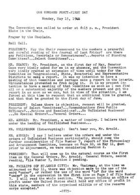 Pages 2875-3160 of the verbatim stenotype transcription of the Debates of the 1943-1944 Constitutional Convention of Missouri. These debates spanned from January 5, 1944 - September 29, 1944. The full transcription includes over 7,000 pages.