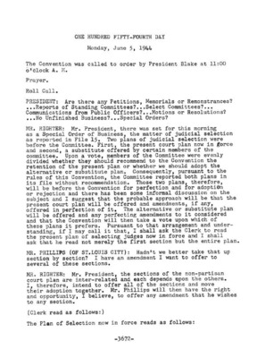 Pages 3672-3957 of the verbatim stenotype transcription of the Debates of the 1943-1944 Constitutional Convention of Missouri. These debates spanned from January 5, 1944 - September 29, 1944. The full transcription includes over 7,000 pages.